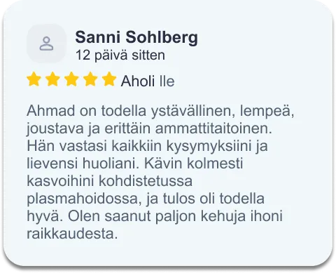 Klinikkamme on turvallinen ja yksilöllinen paikka, jossa jokaisesta asiakkaasta huolehditaan asiantuntevasti ja lämpimästi. Hoidot suorittaa kokenut tiimimme, jota johtaa Aholi, Suomessa koulutettu ja laillistettu sairaanhoitaja. Työskentelemme vain ajanvarauksella, jotta voimme taata yksilöllisen ja korkealaatuisen kokemuksen.