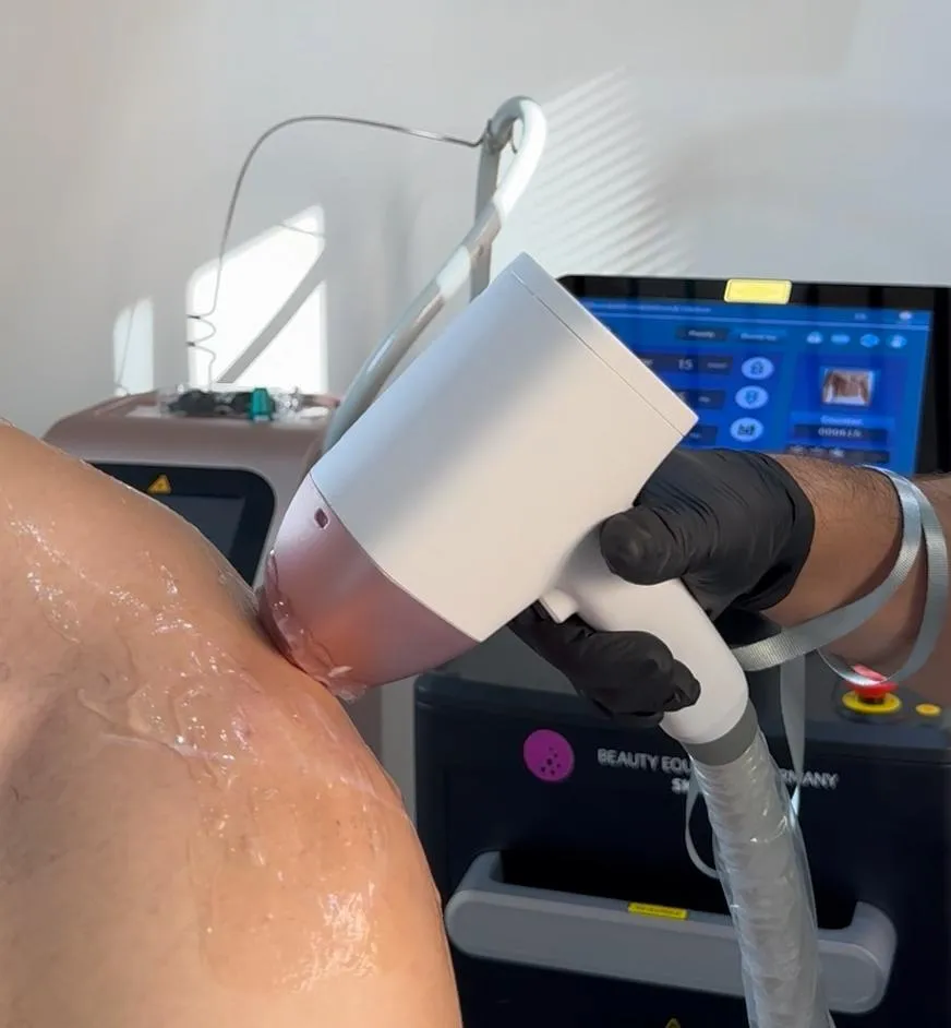 Ultraäänigeeliä levitetään, mikä mahdollistaa optimaalisen siirron laitteesta hoidettavalle alueelle. Sen jälkeen laite asetetaan iholle ja sen tehoa säädetään ihotyypin ja alueen mukaan.